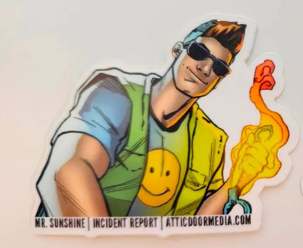 Here’s where the fun begins. We offer different stickers featuring characters from our IPs. Maybe they pick Mr. Sunshine, the fire-powered local who we lovingly refer to as the fabled Florida Man™. Maybe they pick Prince Kavan, a royal runaway searching for his kidnapped sister. Once they choose, we flip to the page in the comic where that character appears, give a short description, and let them browse through the comic on their own.