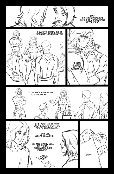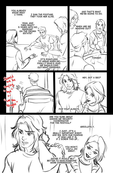 On Page 11, Allie recommended dialogue be added to panel 3. She’s split panel 3 and 4, which were a single panel in my script.