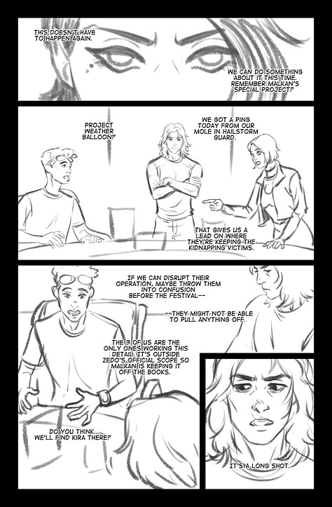 This is a problem I’ve had before. I’ve been trying to limit my script pages to 5 panels each until I get the hang of one panel’s worth of action. I broke my rule for this page and we ended up splitting it into two.