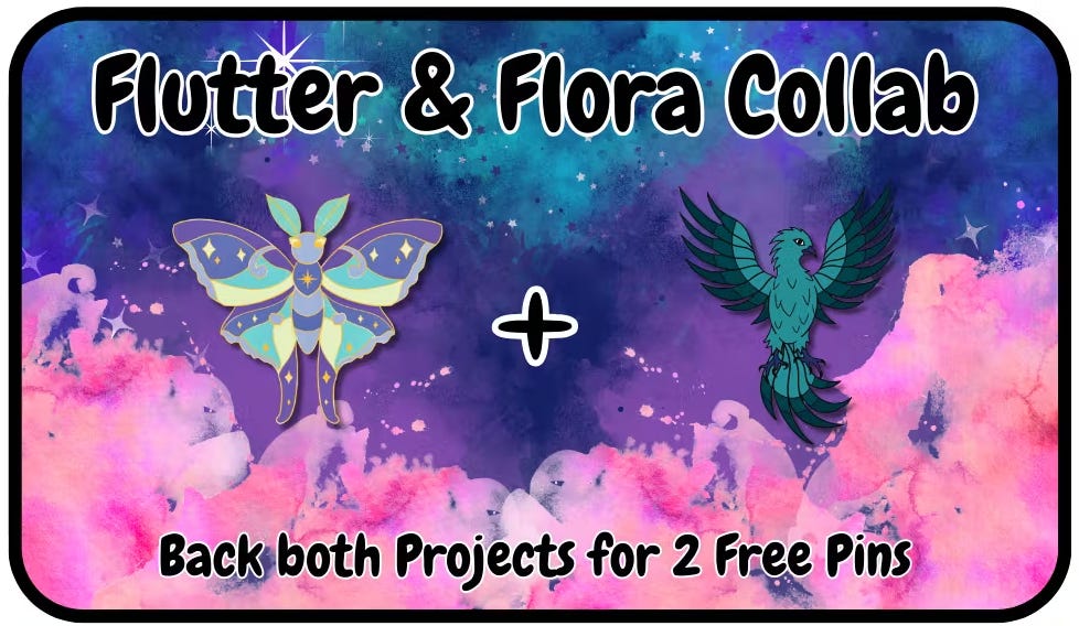 MythFall fans take note: we are partnered with a moth themed pin campaign! Flutter & Flora Enamel Pins by Midnight Mica Art feature a blend of dark forest magic, with enchanting moths and delicate flowers. If you back both campaigns, you’ll receive a free pin from each.
