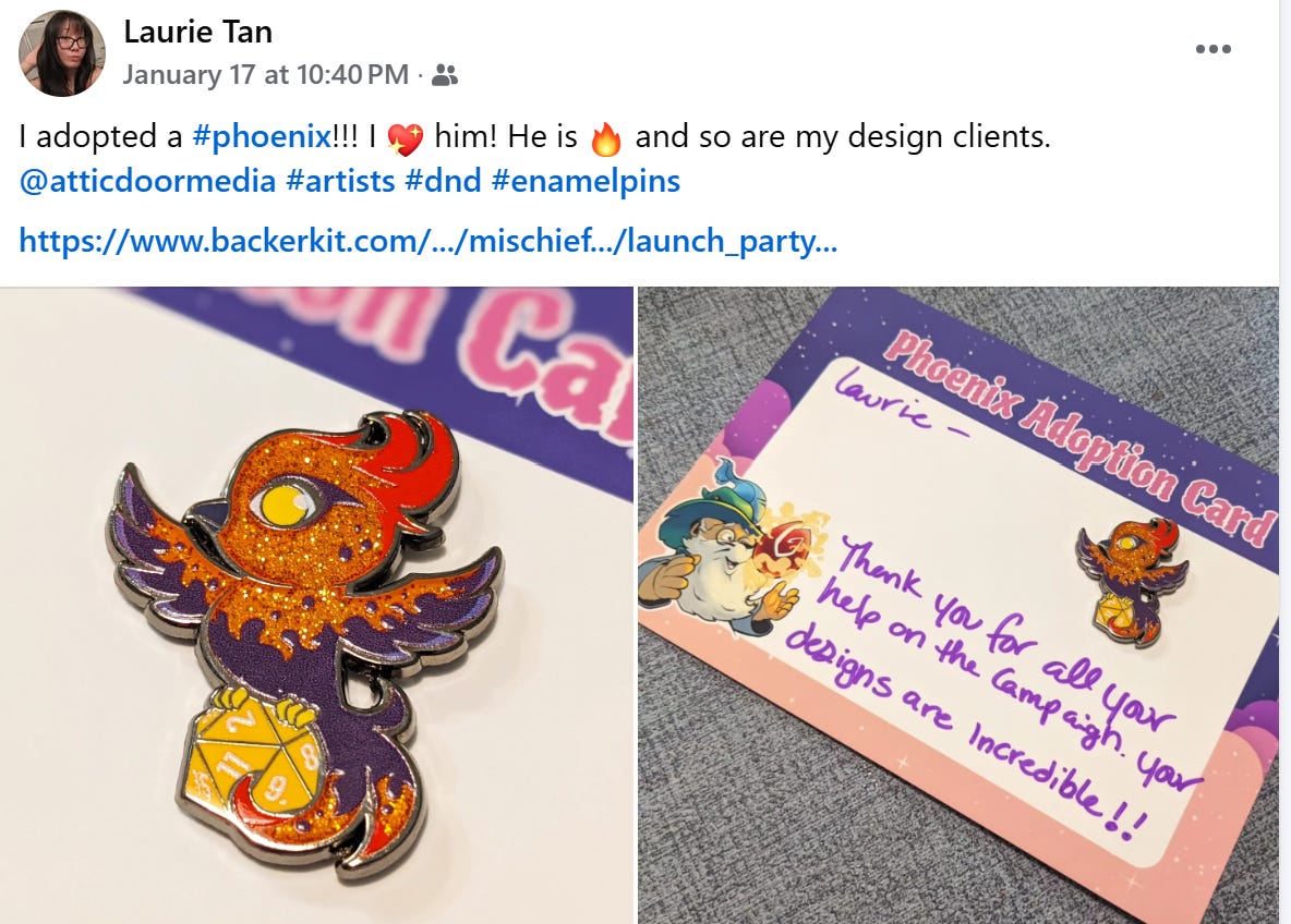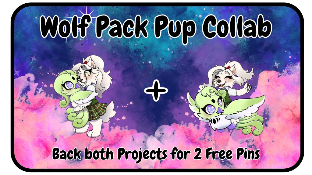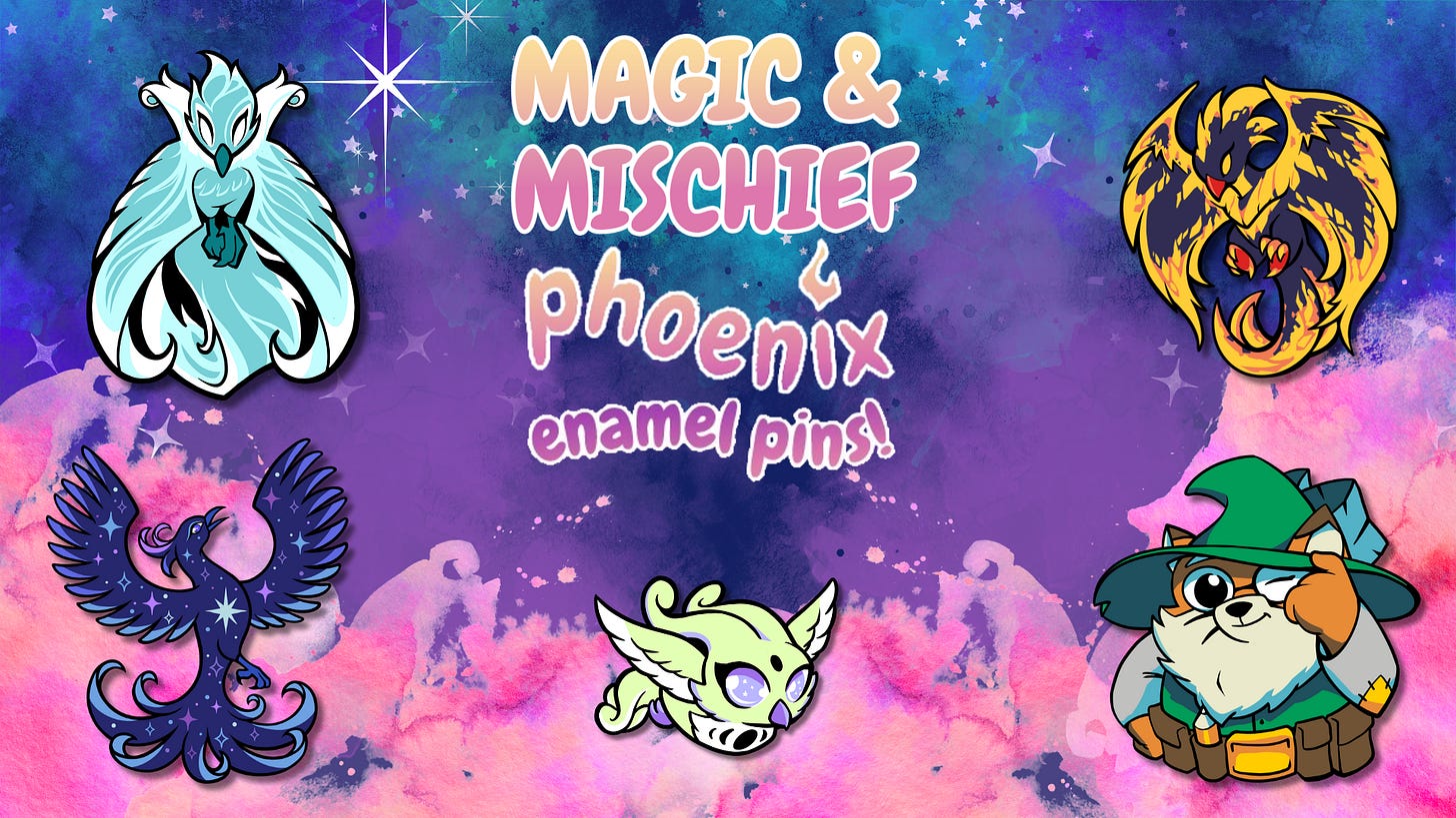 Our second indie comic collab! If you back both our campaign and Wolf Pack Pups, you’ll get a free pin from each. They feature our new Moon Phoenix hanging out with Snow Paw the werewolf.