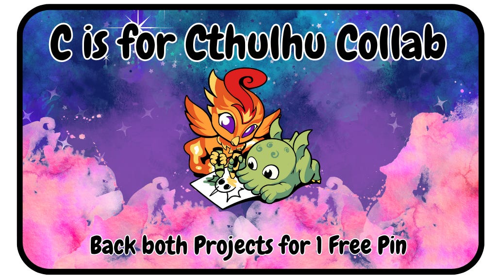 The first of our two indie comic collabs! If you back both our campaign and C is for Cthulhu, you’ll get a pin of baby Cinder and baby Cthulhu coloring together.